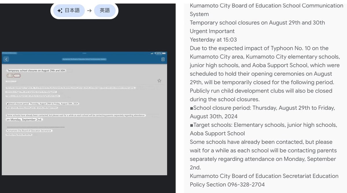 Karena dampak yang diperkirakan dari Topan No. 10 di wilayah Kota Kumamoto, sekolah dasar dan menengah di Kota Kumamoto, serta Sekolah Dukungan Khusus Aoba, akan ditutup dari Kamis, 29 Agustus hingga Jumat, 30 Agustus. Selama penutupan sekolah, program perawatan setelah sekolah publik juga akan ditangguhkan. Detail lebih lanjut mengenai kehadiran sekolah pada Senin, 2 September akan diberitahukan kepada orang tua oleh masing-masing sekolah.
