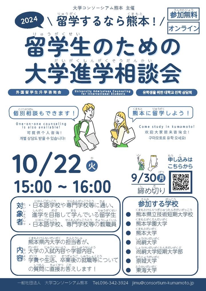 Consortium Kumamoto will be holding an online information session about university admissions on Tuesday, October 22, at 3:00 PM.