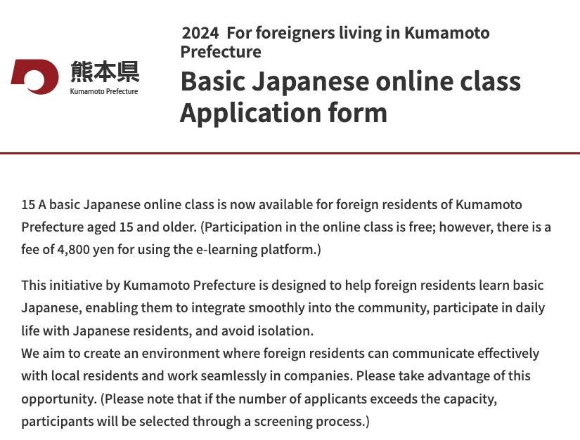 — start translation — Application Period: October 2, 2024 (Wednesday) until the class reaches capacity Eligibility: Foreign residents aged 15 and older living in Kumamoto Prefecture Cost: ¥4,800 (tax included, bank transfer fee not included) — one-time payment for ¥800 per month Requirements: