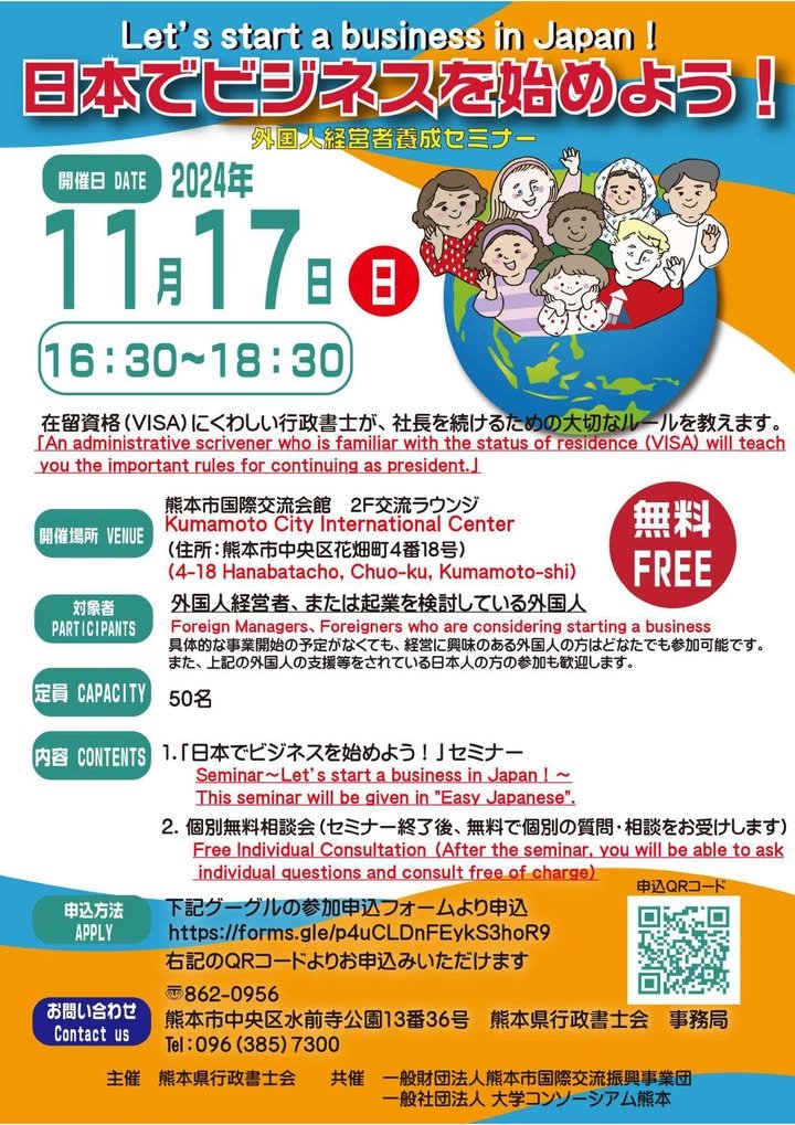 Let’s Start a Business in Japan! Free consultation for interested international residents in Kumamoto Date/Time: November 17 (Sunday) 16:30-18:30 Venue: Kumamoto City International Center