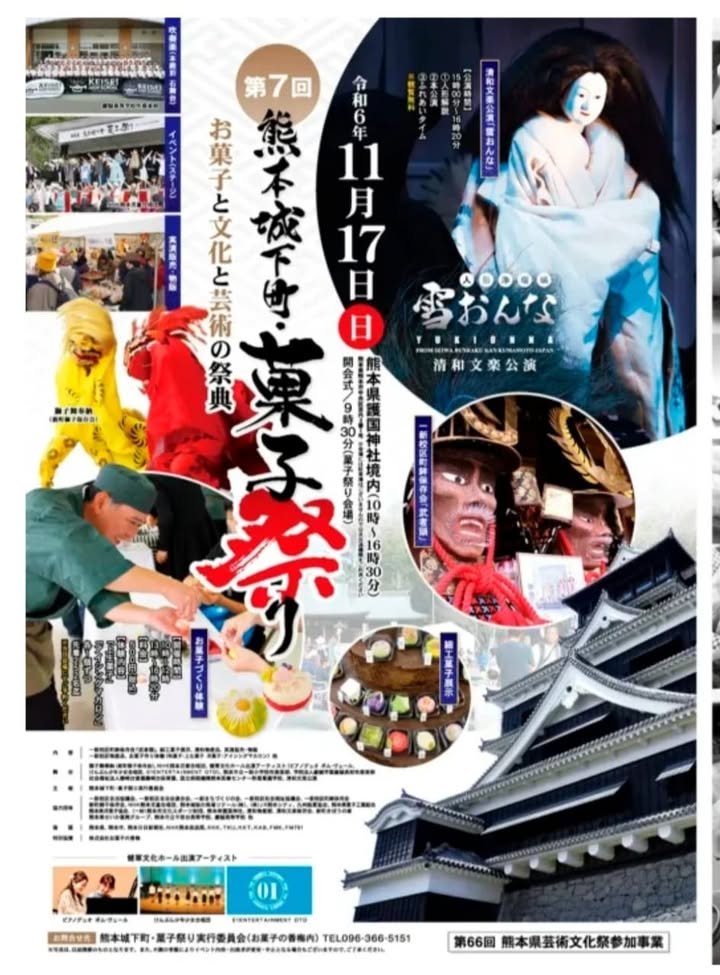 The 7th Kumamoto Castle Town Sweets Festival will be held at 10:00 am on Sunday, November 17, 2024, at the grounds of Kumamoto Prefectural Gokoku Shrine, next to Fujisakidai Baseball Stadium. A variety of events will be held on the stage in the center of the shrine grounds. The Seiwa Bunraku performance “Snow Woman” will draw you in with its puppets that seem to have life. There will also be a variety of performances such as dancing, singing, and theater.