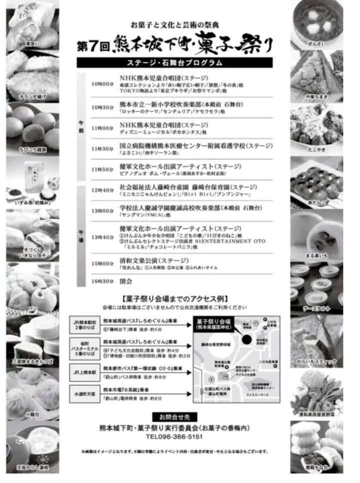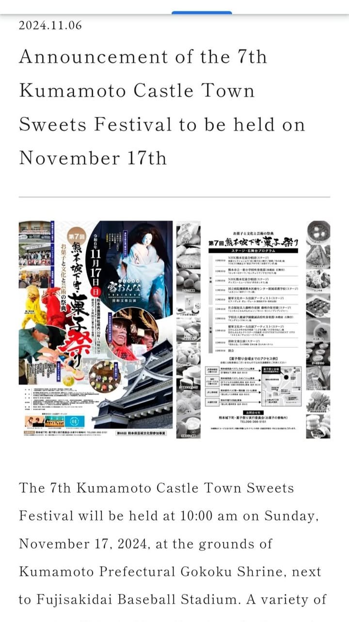 Date and time: Sunday, November 17, 2024 Time: 10:00-16:30 Location: Kumamoto Prefectural Gokoku Shrine grounds (3-1 Miyauchi, Chuo-ku, Kumamoto City) Inquiries: Kumamoto Castle Town Sweets Festival Executive Committee (Okashi no Kobainai) Phone number: 096-366-5151