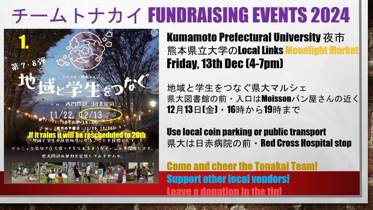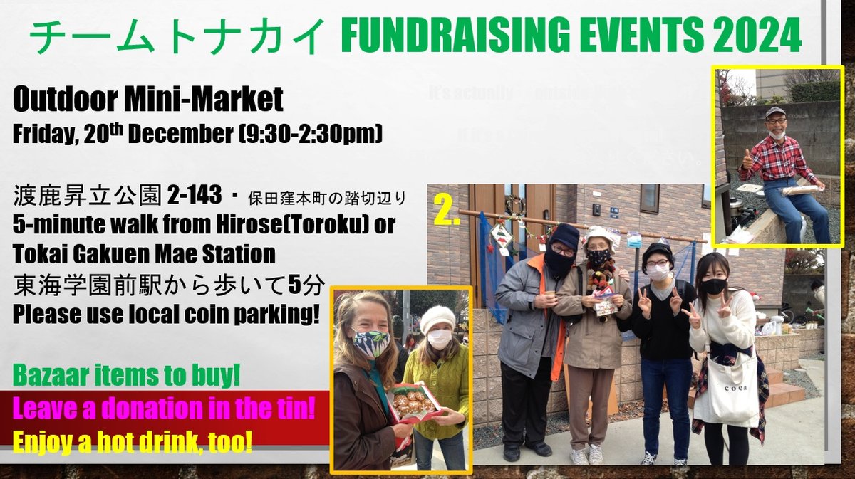 If you’re able to pop along to an event this year please do so! ① 13 Dec. at 県立大学 from 4-7pm🎄 ② 20 Dec. from 9:30-2:30pm near 渡鹿昇立公園 🎁 ③ 22 Dec. at 砂取コミュニティーセンター from 9:30-4:30pm ☕ For more details see the images attached!