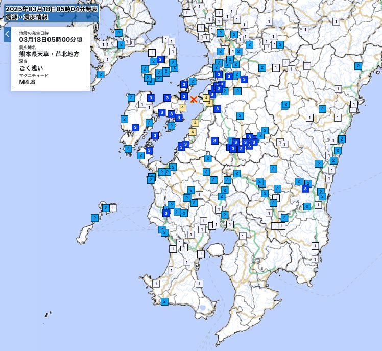 Kirk here with some information about the earthquake warning that woke me up this morning at about 5 AM. I got this huge warning but couldn’t feel anything. I ignored it and went back to sleep, assuming it was some kind of false alarm. Well, for my neck of the woods (central Kumamoto City) it was a false alarm but folks to our southwest may have felt significant shaking.