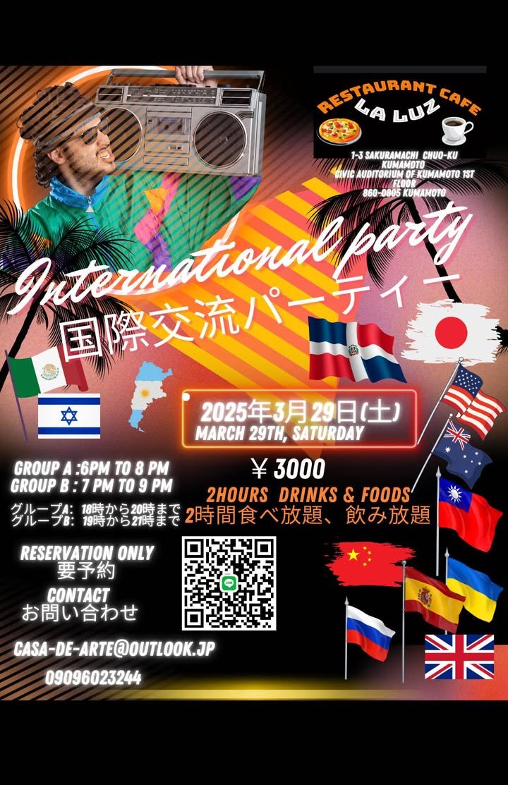 International Party with drinks and food at La Luz, near Sakuramachi, happening next Saturday, 29th March ๐ป๐ฆ๐ท๐๐ฒ๐ฝ Choice of either a 6pm or 7pm start! Contact the Argentinian owner, and local Tango instructor, Hernan, to book your spot! ๐ต๐ท๐ถ