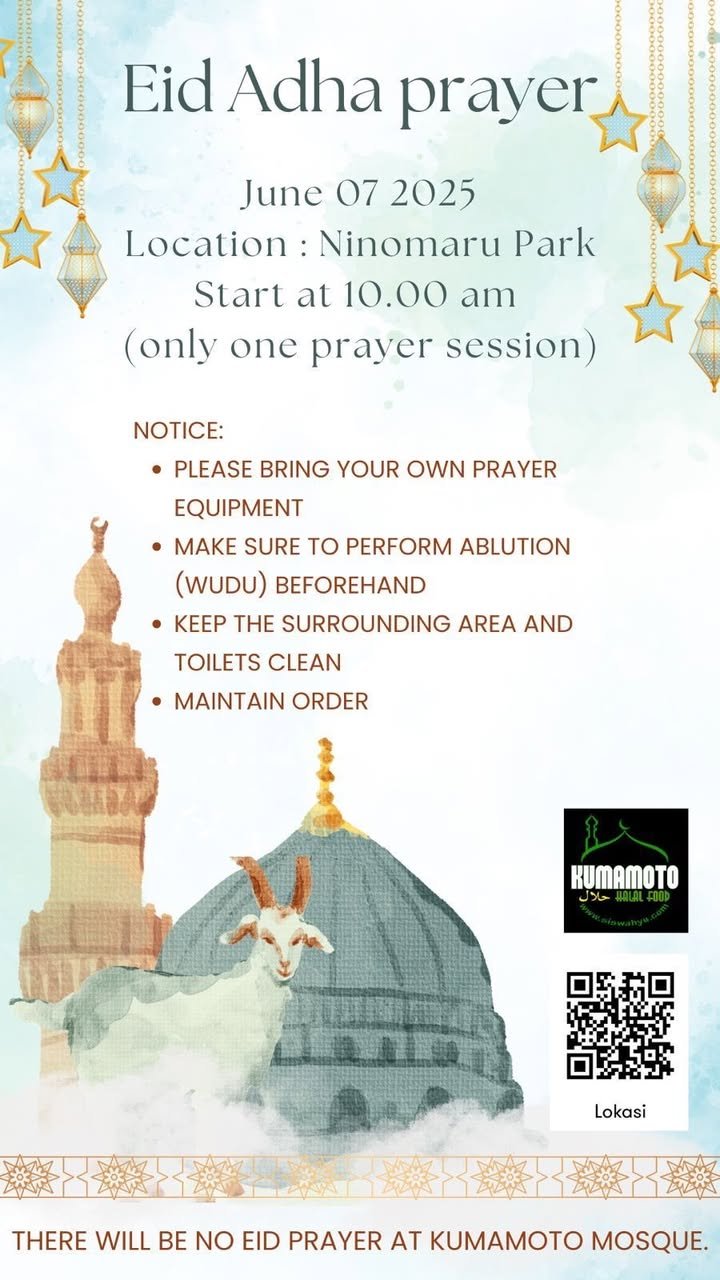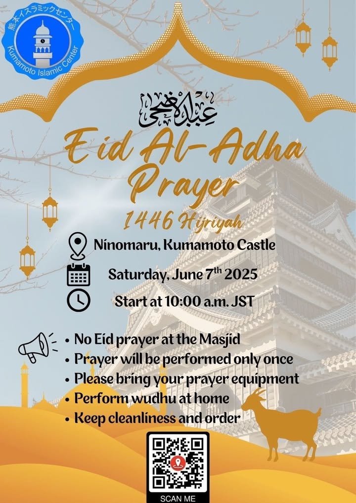Hi Johannes here. As society gradually opens up to foreigners, religious life here in Kumamoto is also becoming increasingly diverse. In this context, I would like to point out an interesting festival that will take place on Saturday at 10:00 am in the park of Kumamoto Castle. The Eid al-Adha is the Islamic Feast of Sacrifice, which is the climax of the Hajj. Anyone is invited to join the venue.