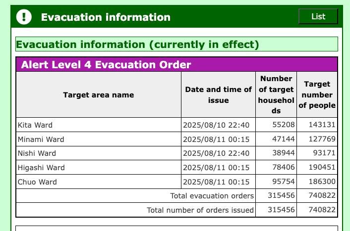 This issue of an “evacuation order” not really being an order is the same for Japanese and English. Whichever language you are reading, what the website tells you to do is not REALLY what you should do. If the 740,822 people subject to the “order” really did try to evacuate, that would cause its own disaster. Another issue is that 避難 (hinan; evacuation) isn’t really “evacuation”. The characters mean “avoid danger”; and, in Japanese, you can actually 避難する (hinan suru) at home!!