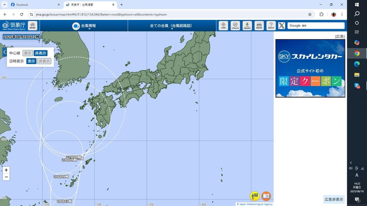 We've got a typhoonette coming. - William August 18, 2025 at 05:24 JST 2025 We’ve got a typhoonette coming. - William ↗ View original post on Facebook For a link to the original post on Facebook, open this page on a computer. ← 2025-08-17 23:02 JST 2025-08-19 01:58 JST → Around this time … 2025-08-24 05:03 JSTAtsuko here. 2025-08-23 03:53 JSTKirk here. Atsuko's post about Amakusa reminded me of this … 2025-08-22 07:11 JSTDear Amakusa Mogushi, Onikizaki fans. 2025-08-21 04:40 JSTKirk here. When a falling star is very bright it can be … 2025-08-19 01:58 JSTOne of my favorite cartoons depicts a foreign jogger … 2025-08-18 05:24 JSTWe've got a typhoonette coming. - William (this post) 2025-08-17 23:02 JSTKirk here. It's been a while since I've visited this tunnel. … 2025-08-15 00:22 JSTKumamoto Tokai Dai Seisho Second Round Game - Koshien … 2025-08-13 01:01 JSTAbout collection of disaster garbage due to heavy rain … 2025-08-12 21:19 JSTKirk here. I complained about EVERYONE getting repeated … 2025-08-11 18:23 JSTKirk here. In a comment I'll put a link to this video …