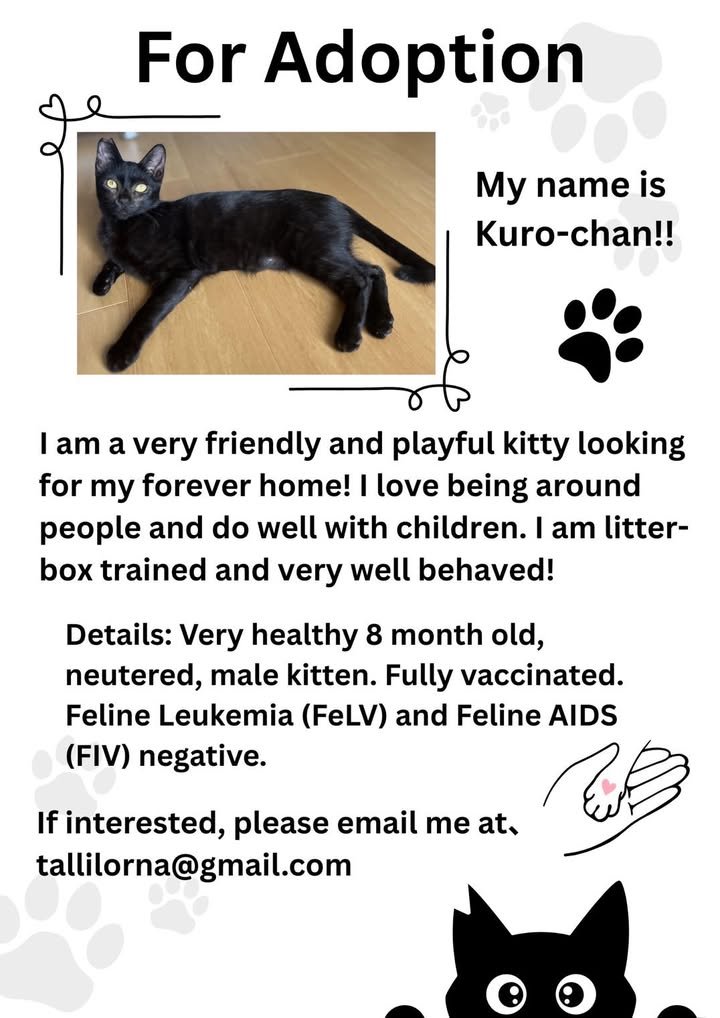 For cat lovers! My friend found a ~8 month old kitten the other day. With the help of her friend she took the kitten to the vet and had him neutered and given all his shots/and tests. He’s very friendly and very well trained.