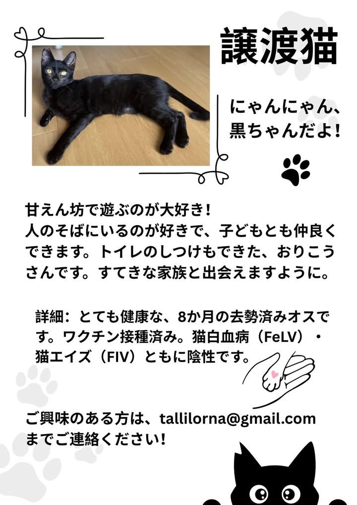 She is seeking a new home for her cat. My friend is a newly arrived ALT at the high school, having just come from America in September, so I advised her to put up flyers in Japanese and English at her high school. Thinking there might be cat lovers and those interested in international exchange here too, I’ll share the flyer here as well. I hope you have a good encounter.