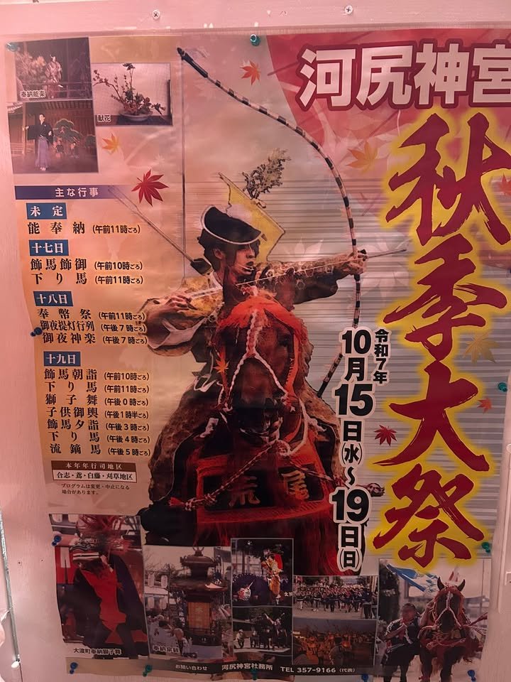 Atsuko here.٩(ˊᗜˋ*)و The four days from Thursday to Sunday mark the Autumn Grand Festival at Kawasiri Shrine. The Grand Festival at Kawasiri Shrine sees four neighbouring districts take turns every fourteen years to bear responsibility for the festival offerings.The festival is a wonderful occasion where not only the local organisers but also parents and children, including the little ones, participate in large numbers. This is a good thing, as it allows for prayers for the region’s peace and prosperity, expressions of gratitude, and wishes for the children’s healthy growth. It was also lovely to see the young people, reunited like at a school reunion, enjoying themselves and celebrating their meeting. This year, our district is responsible for dedicating. The festival continues today, featuring the Sagariuma and Yabusame events.