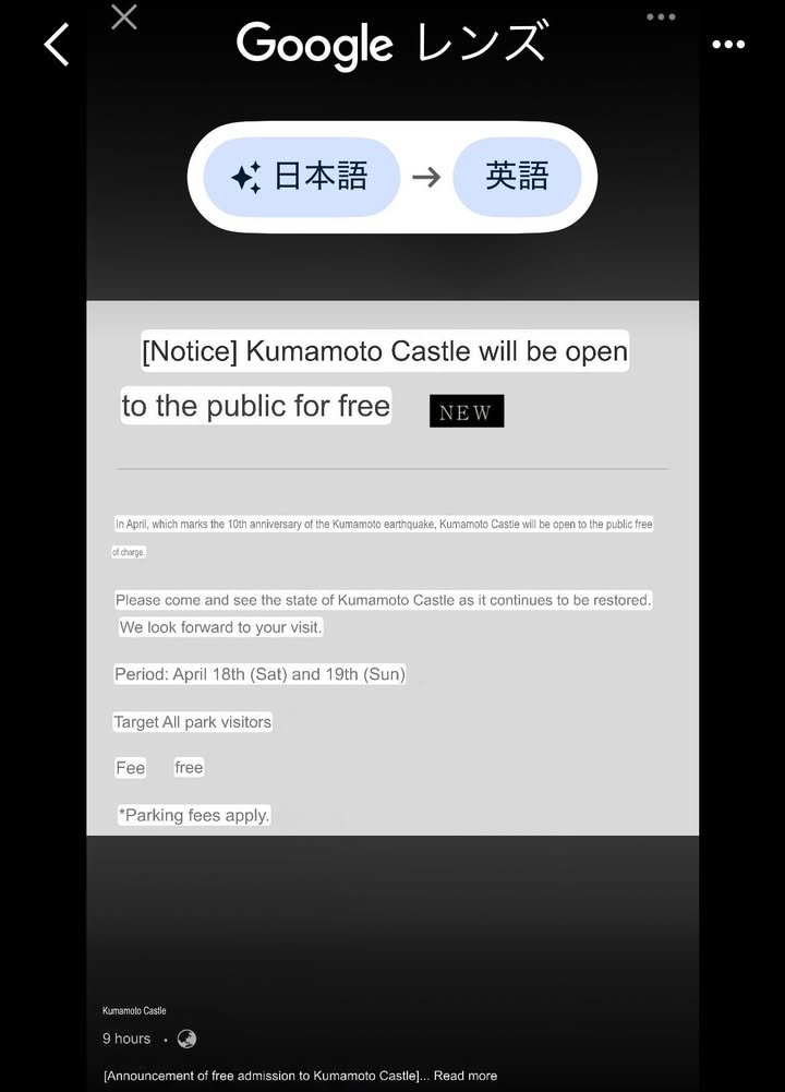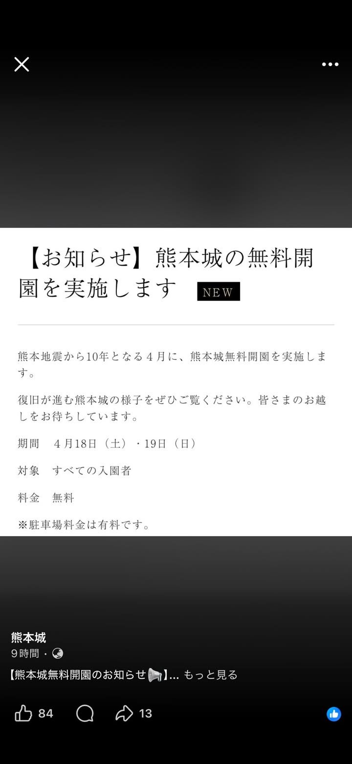 Atsuko here. [Notice] Kumamoto Castle will be open to the public for free.(੭˙꒳˙)੭ ーーーーーーーーーーーーーーーーーーーーーーー In April, which marks the 10th anniversary of the Kumamoto earthquake, Kumamoto Castle will be open to the public free of charge.