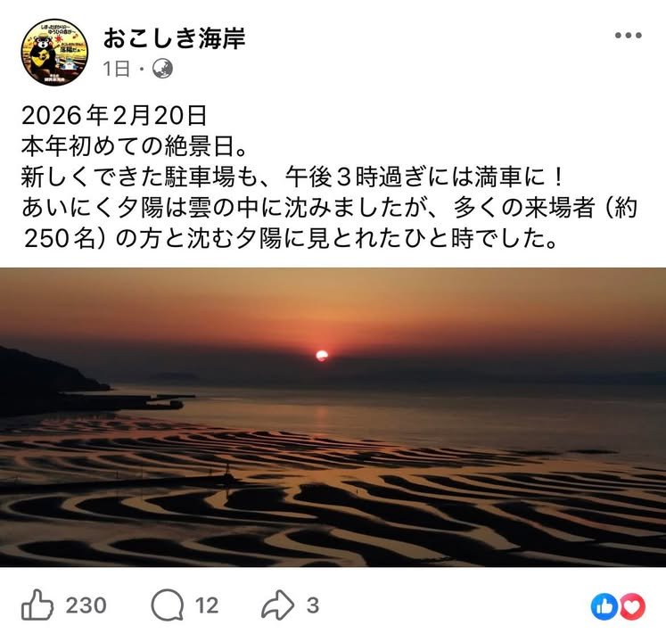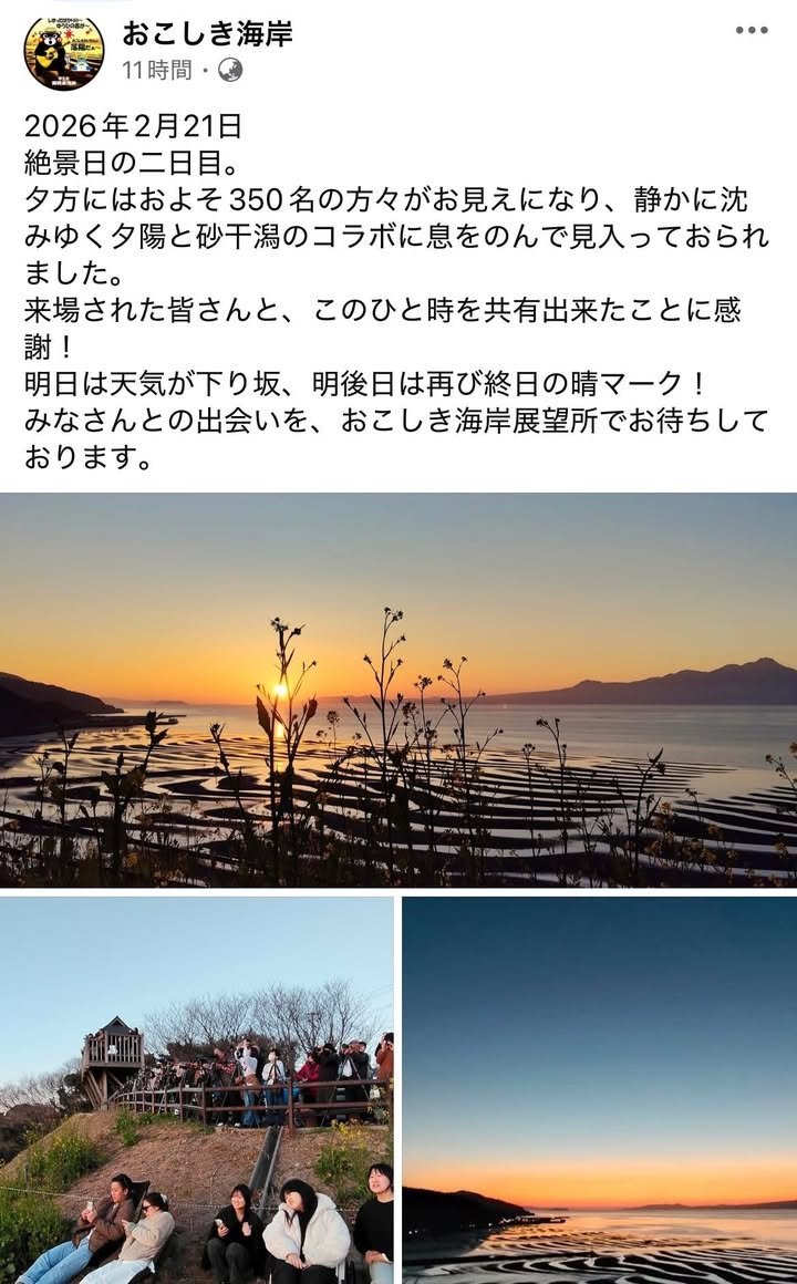 The season of spectacular views has arrived! 【Guide Map to Okoshiki Coast Viewpoint】 ※The name “Okoshiki Coast Mudflat Scenic Area” has been changed to “Okoshiki Coast Viewpoint” from May 2025. Ground Course: https://youtu.be/mF_VZwRFGNM Viewable on YouTube via the link. For the return journey, follow the directions via the QR code on the observation point’s information board POP. 【Okoshiki Coast Tide Table - February 2026】 This month’s spectacular viewing days are four days from 20th to 23rd February. Additionally, from 4th to 7th February and on 19th February (five days in total), whilst not quite reaching spectacular viewing day levels, you can witness the collaboration between the sandy tidal flats stretching into the distance and the setting sun. We look forward to welcoming you at the Okoshiki Coast Observation Deck. Yellow and orange on the tide chart indicate low tide coinciding with sunset. Yellow (Spectacular View Days)・・・View the vast tidal flats and sunset. Orange・・・・・・View the expansive tidal flats and sunset. Blue ……………… Offers views of the vast tidal flats, though not coinciding with sunset. Additionally, the car park being constructed above the Okoshi Coast Observation Point is nearing completion. Work on the existing car park is scheduled to commence in early January. Please also note that the road from the Toguchi side is closed to traffic on weekdays due to widening works. Details regarding the construction works will be posted once information is received from the relevant department at the City Office. ※ The Okoshi Coast tide table has used values from “Tide MieYell” since 2015. Please note that low tide times and tide levels may differ slightly depending on the tide table used.