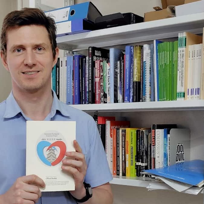 On the night of April 14, 2016, he was struck by violent shaking at his apartment in Kumamoto City. Terrified, he pulled a mattress over his head to protect himself. Two days later, during the “main quake,” he evacuated to Kumamoto University with a Japanese student from the next room. The gymnasium was full, so they waited outside through the night.