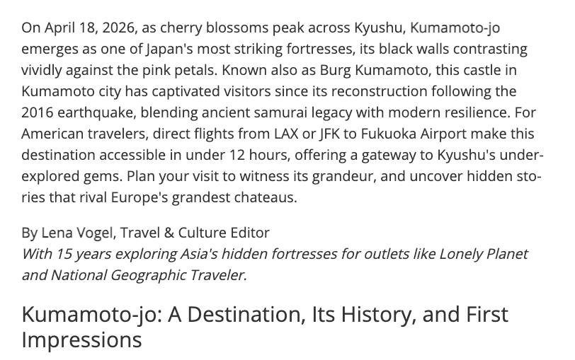 Here's a lengthy article on Kumamoto Castle. I think the target audience is prospective tourists. --Kirk https://www.ad-hoc-news.de/boerse/news/ueberblick/kumamoto-jo-japan-s-majestic-black-castle-in-kumamoto/69186714